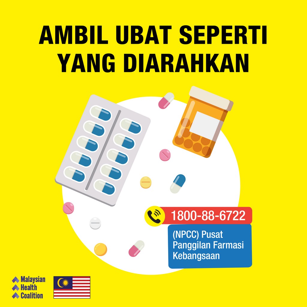Jika anda mempunyai penyakit kronik, pastikan bekalan ubat anda tidak terputus. Bekalan ubat susulan boleh didapati menerusi perkhidmatan tambahan yang disediakan oleh KKM seperti Pos Malaysia, Pandu Lalu dan Locker4U. Ini bagi memastikan bekalan ubat anda mencukupi sepanjang tempoh PKP. Hubungi Klinik Kesihatan berhampiran atau Pusat Panggilan Farmasi Kebangsaan (NPCC) di talian 1-800-88-6722 untuk bantuan.Jika anda mempunyai kenalan berpenyakit kronik, bantulah mereka mendapatkan bekalan ubat jika berkesempatan.